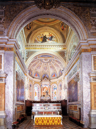 La decorazione del presbiterio e del coro si svolse a più riprese nel corso dei secoli. Il coro ligneo in noce massiccia venne eseguito nel corso del 17°secolo dall'agostiniano Vincenzo Rossi da Fermo e dal fratello Filippo. L'altare maggiore, ornato di marmi, venne eseguito nel 1905 per volontà dell'Ordine Agostiniano in occasione del sesto centenario dalla morte di S. Nicola. La cupola venne eretta nel 1859 dall'architetto Giovan Battista Carducci ed affrescata nello stesso anno da Luigi Fontana (1827 -